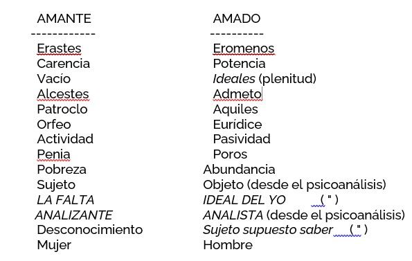 Comienza Fedro diciendo que Eros es un dios muy grande, cosa que después le discutirá Sócrates, cuando le toque el turno de hablar, diciendo que el Amor es un gran genio, un demonio, un daimon. Los daimon son, en general, los héroes que cuando mueren se convierten en tales porque en vez de ser hijos de dioses eran hijos de un dios y una mortal o de una diosa y un mortal, que eran protectores del hogar; como las palabras sufren su evolución y toman sentidos antitéticos, posteriormente daimon llegó a tomar la actual acepción de demonio malvado en lugar de protector. Va a mostrar Lacan como Fedro revela que en la estructura de Eros hay dos lugares: el lugar del amante (erastés) y el lugar del amado (eromenos); son dos lugares en el amor que no son homologables, son completamente distintos, pero sí pueden ser intercambiables. En una relación amorosa en un momento dado uno puede ser amante y en otro momento ocupar el lugar del amado. Y pone del lado del amante: la carencia y la actividad; y del lado del amado: la potencia y la pasividad. Ahora bien, los dioses no llegan a comprender muy bien las cuestiones del amor. Y ¿por qué no lo comprenden? Pues precisamente por eso, porque son dioses y como tales no tienen faltas, no tienen carencias, se puede decir no pueden ser amantes.